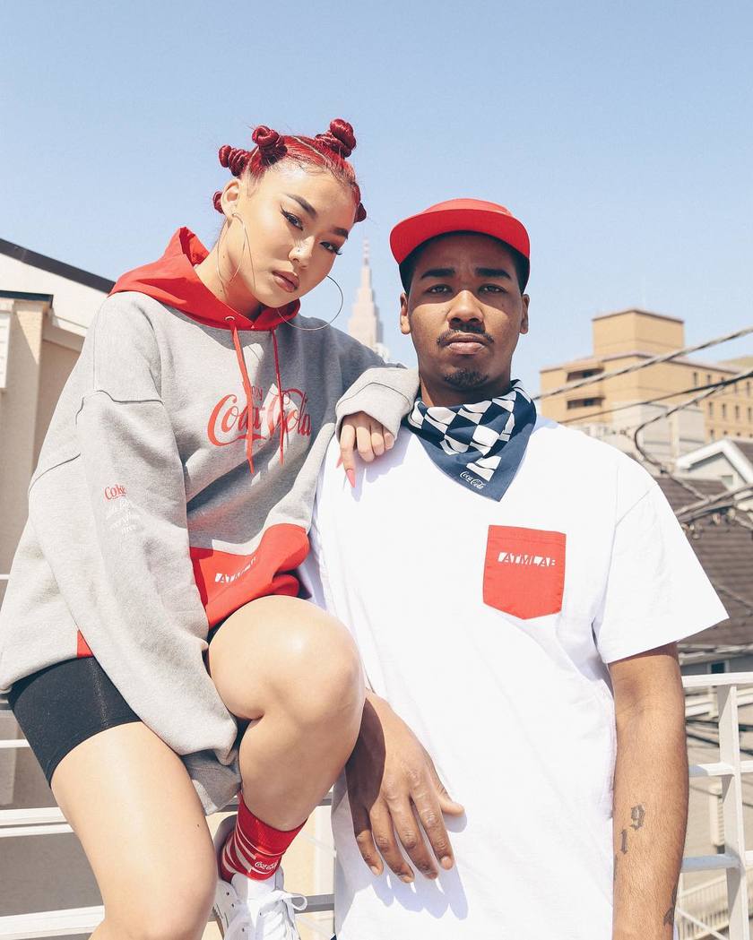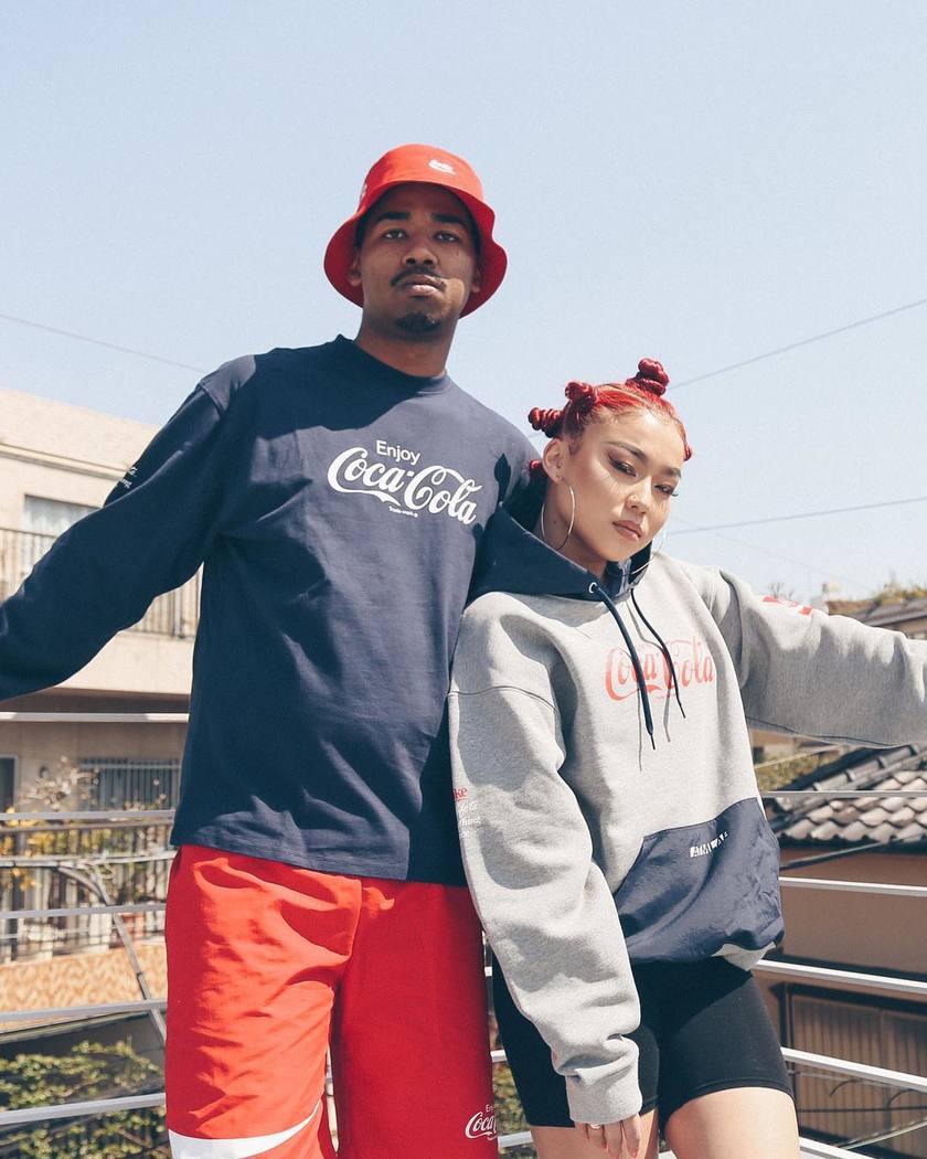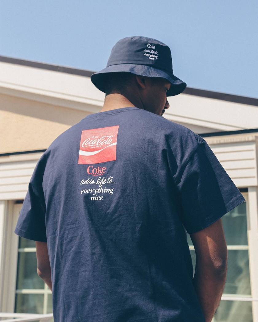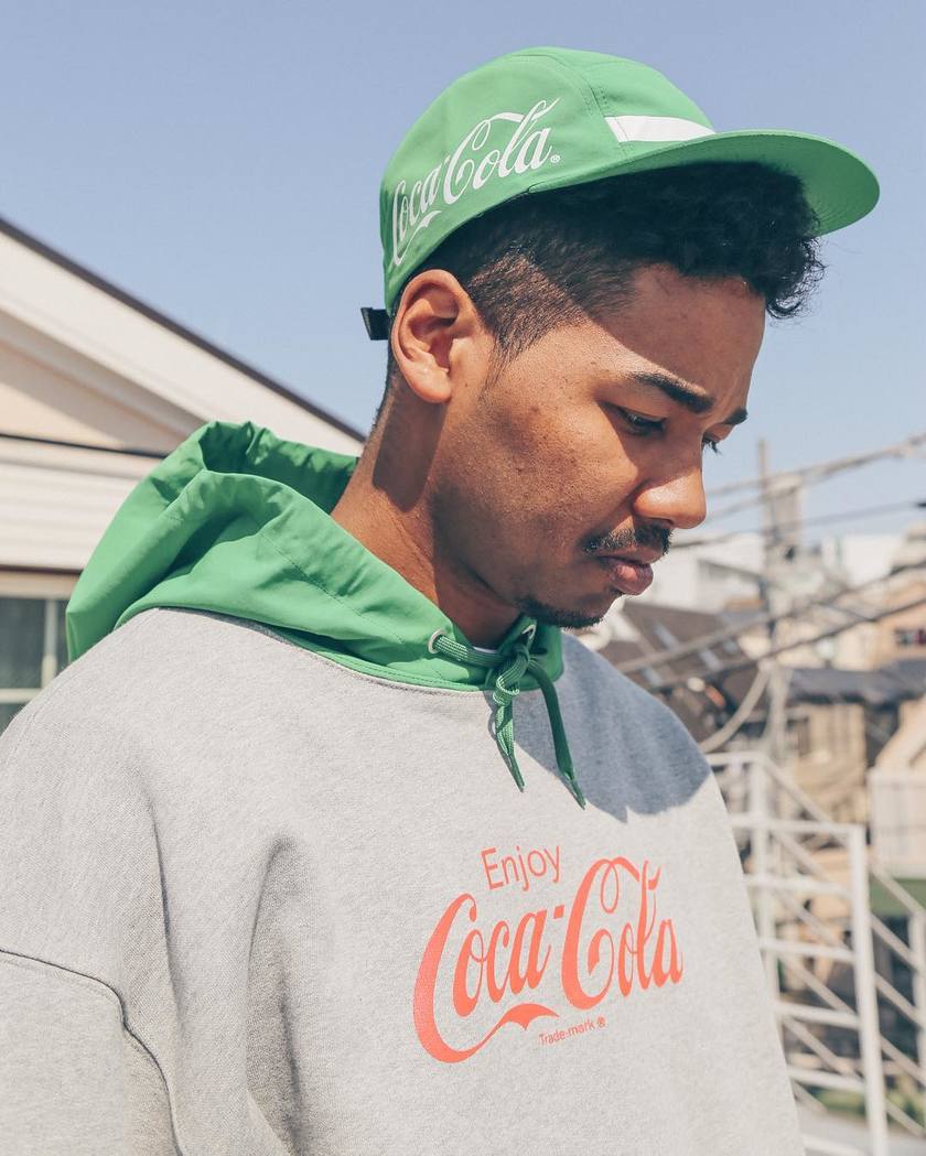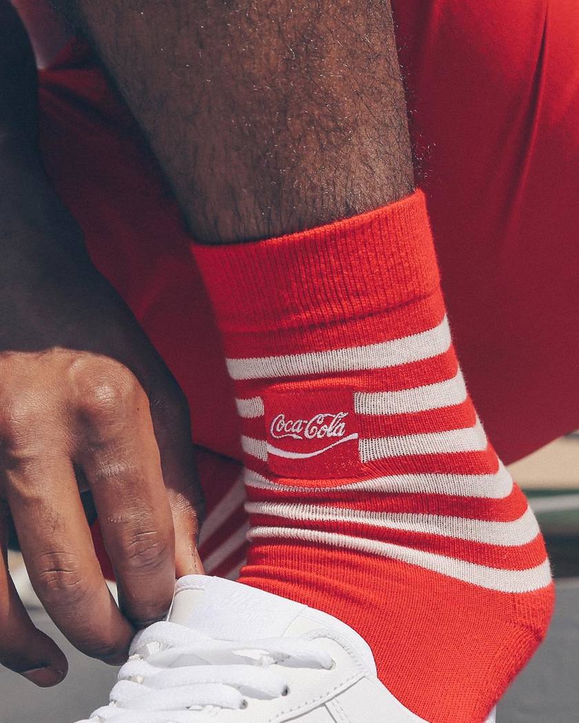 本次单品包括 T恤、卫衣、短裤、帽子、袜子以及方巾,三色混搭也能搭配出与众不同的休闲潮流感。而超级显眼的 Coca Cola 标志出现在服饰上还是很具趣味性的。