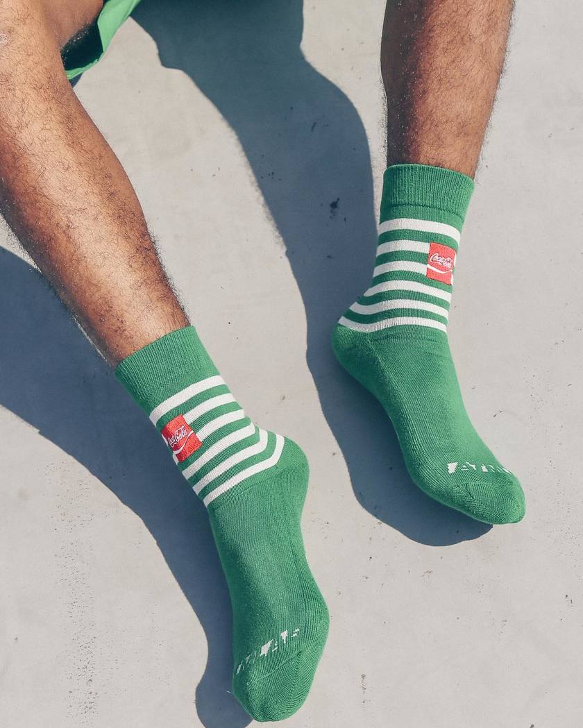 可口可乐也已经有过不少联名,大部分联名也会围绕它标志性的 logo 进行再设计。近日,日本潮流名所 atmos 旗下品牌 ATMOS LAB 也与可口可乐推出了联名系列,虽然本次也没绕开 logo ,但以红蓝绿三色为主打进行设计还是给我们带来了小惊喜。