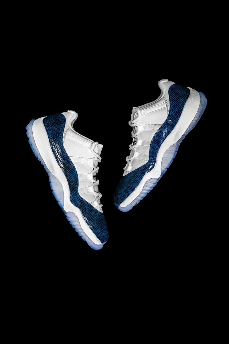 今年首个低帮AJ11,质感和视觉效果对于鞋迷们来说简直是根本把持不住啊~蓝色的蛇纹纹理中点缀黑色,搭配白色皮革鞋面、中底以及冰蓝水晶底,性感狂野气息满满。此外,采用特殊蛇纹鞋盒发售,十分契合主题,无论是自穿还是收藏都是极佳选择!