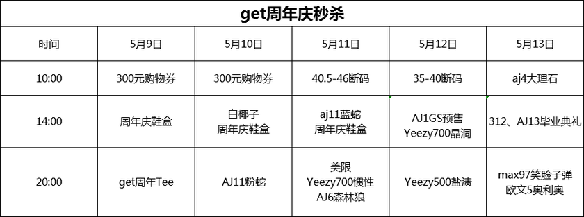 以上的球鞋/服饰好价和抽奖活动仅在get四周年活动期间(5.10-5.13)有效,大家可千万不要错过了哦。最后在这里再次感谢粉丝们对get的支持。