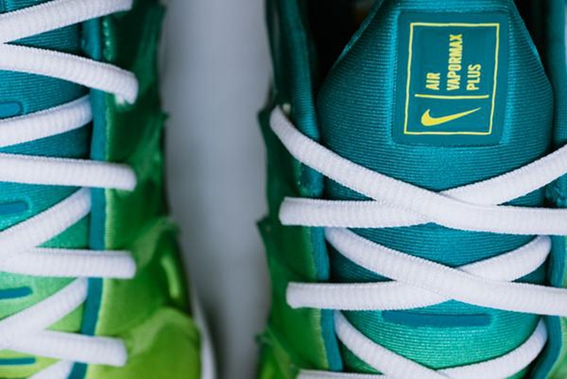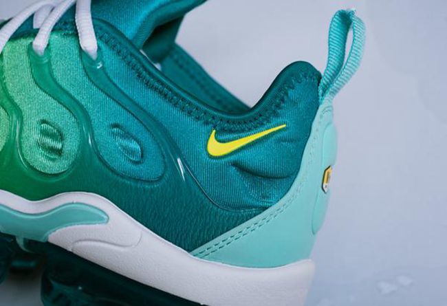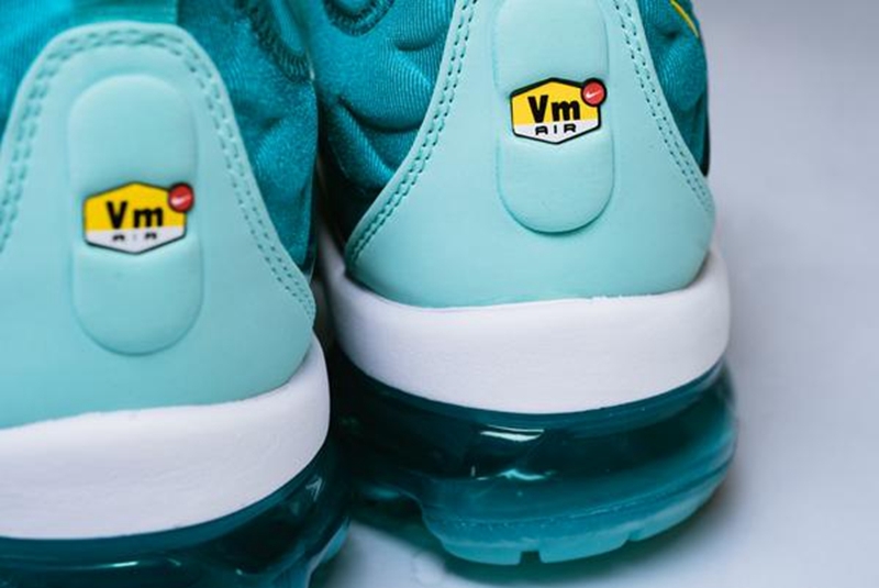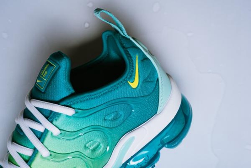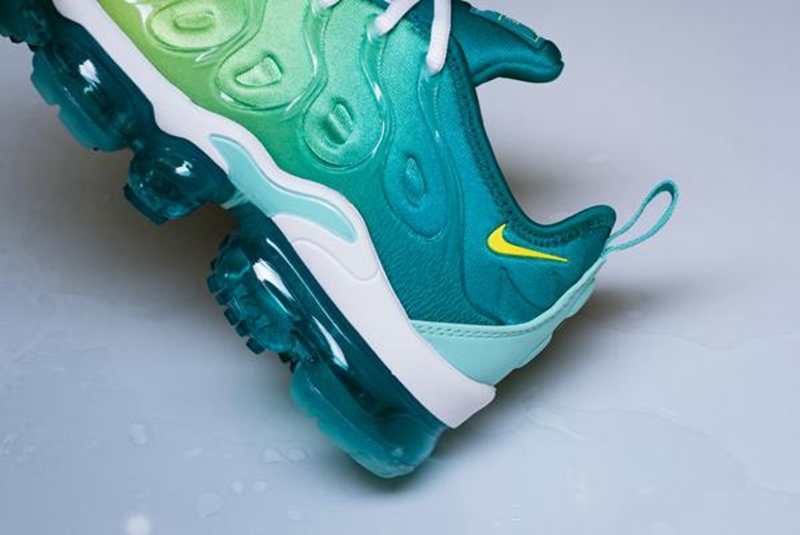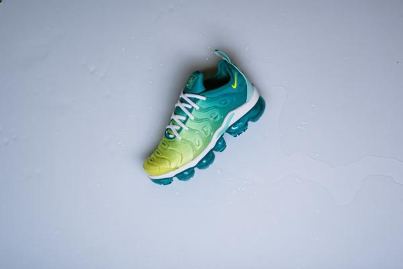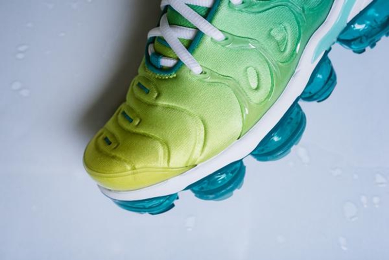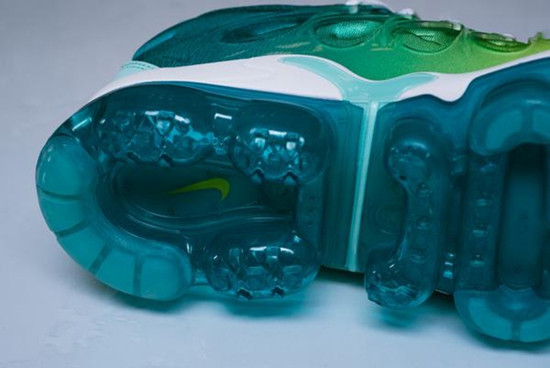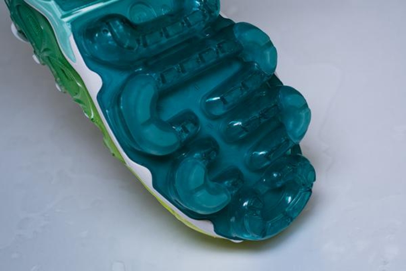 鞋款以黄色和蓝绿色为主打,渐变设计尤其引人注目。搭配鞋身独特的轮廓,以及无法忽视的 VaporMax 大底,整体外观吸睛造型也时尚前卫。