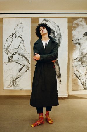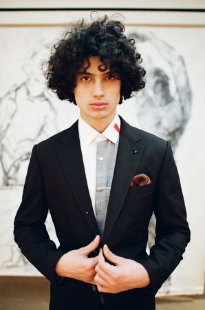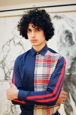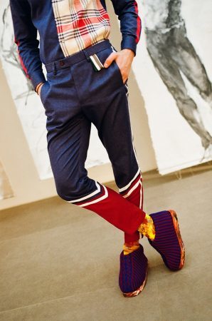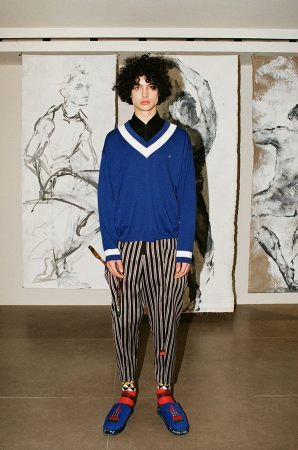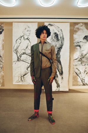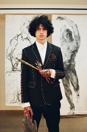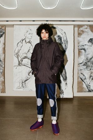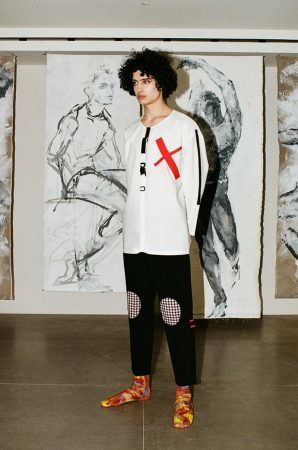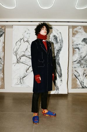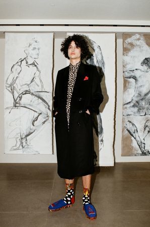 本次系列在设计上继续探索青年与成年的主题,以古典外套为基础,注入了更多变的设计细节。带膝盖设计细节的裤子和带有手工彩色衣领的白衬衫等都是值得注意的亮点。