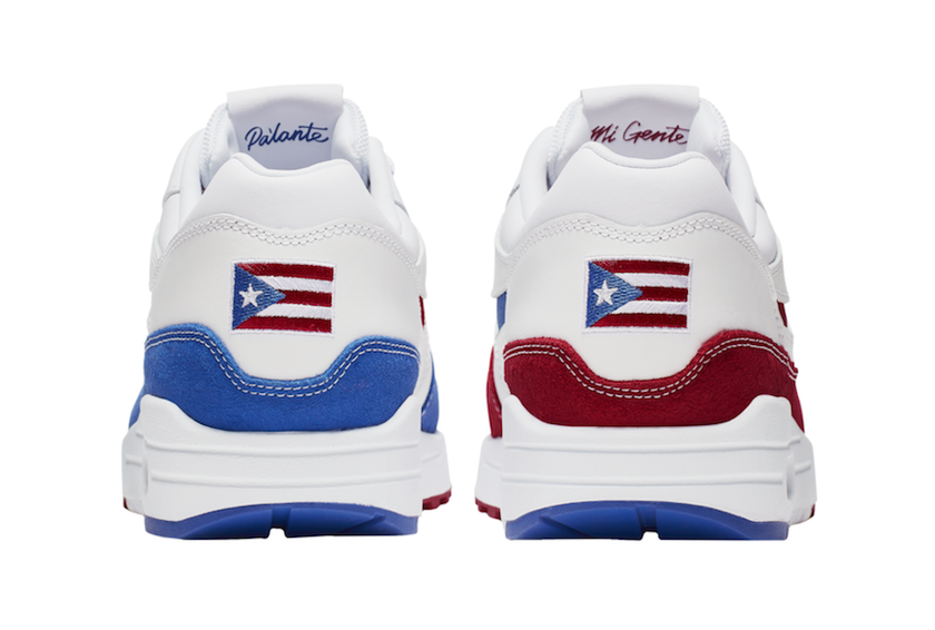 此外,左右鞋垫,鞋舌上的 Nike Air 标志及 PR 字样,也同样以蓝色和红色呈现。鞋舌内也分别注入了“Pa'lante”和“Mi Gente”字样,后跟处也以精致的波多黎各旗帜刺绣呈现,直击本次主题。