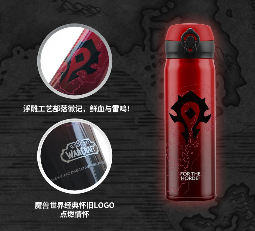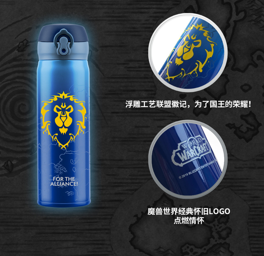 霸气侧漏的阵营主题配色,瓶身采用高品质亮面烤漆,质地细腻精致,触感润滑饱满;浮雕效果的阵营徽记印于卡里姆多及东部王国地图底纹之上,时刻宣誓着自己的阵营和领土!