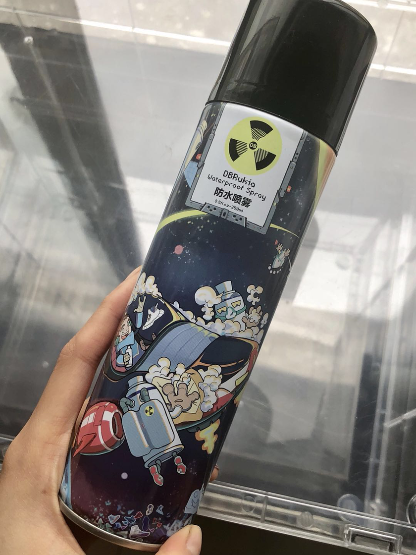拿出防水喷雾。首先,包装和外观设计都很高大上。太空宇航员的图案绘满喷雾全身,很有观赏感。至少在颜值方面,它已经过了我这关。