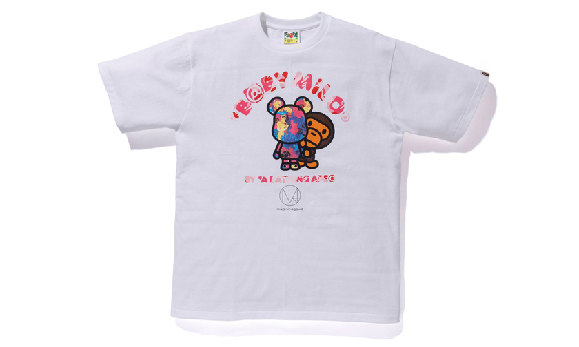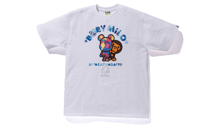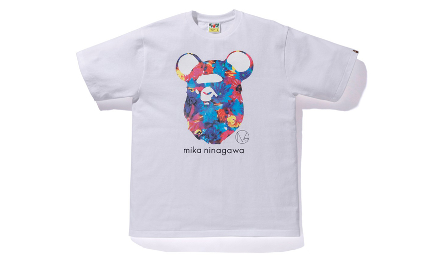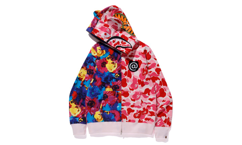 其中鲨鱼卫衣以猿人头迷彩和蜷川实花影像对半拼接呈现,视觉效果异常突出。而T恤上的图案则是吉祥物 BABYMILO 和花卉 BE@RBRICK 的结合体,看着很像猿人头扎着小揪揪,颇具玩味。而联名logo的呈现也彰显了单品的特殊身份。