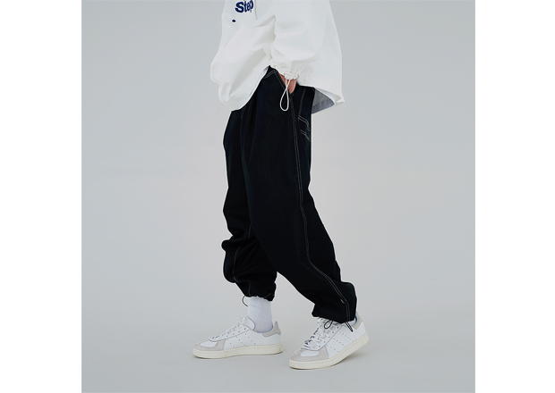 以轻薄的丹宁材质打造的可调节抽绳束脚裤,非常有格调,也给穿搭带来了更多可能性。以整齐的车线勾勒的口袋和整体轮廓,展现了 FMACM 对于细节的极致把控,高级感扑面而来。