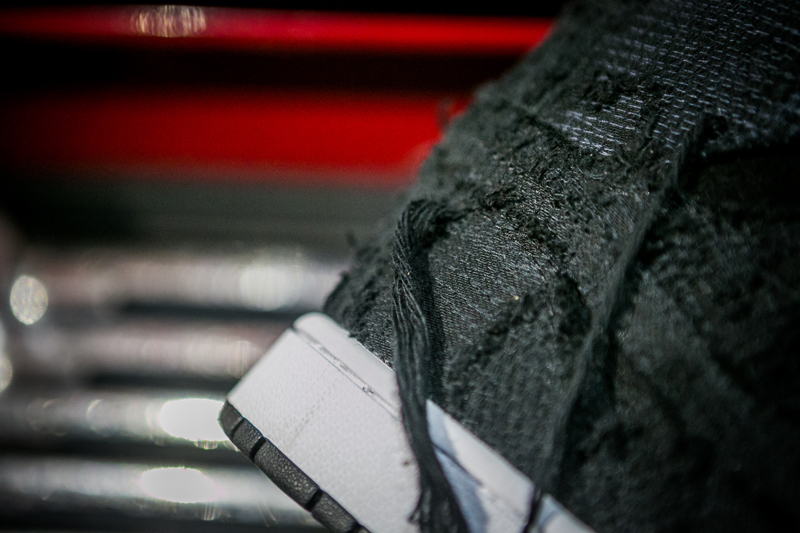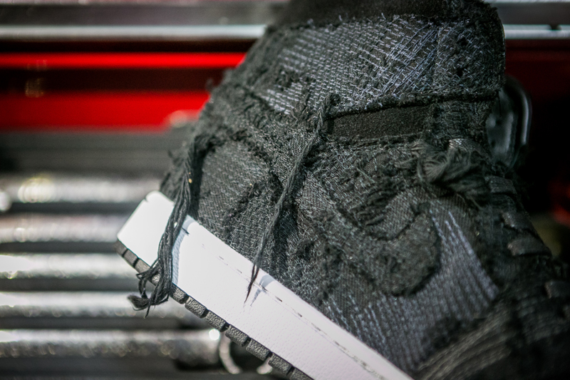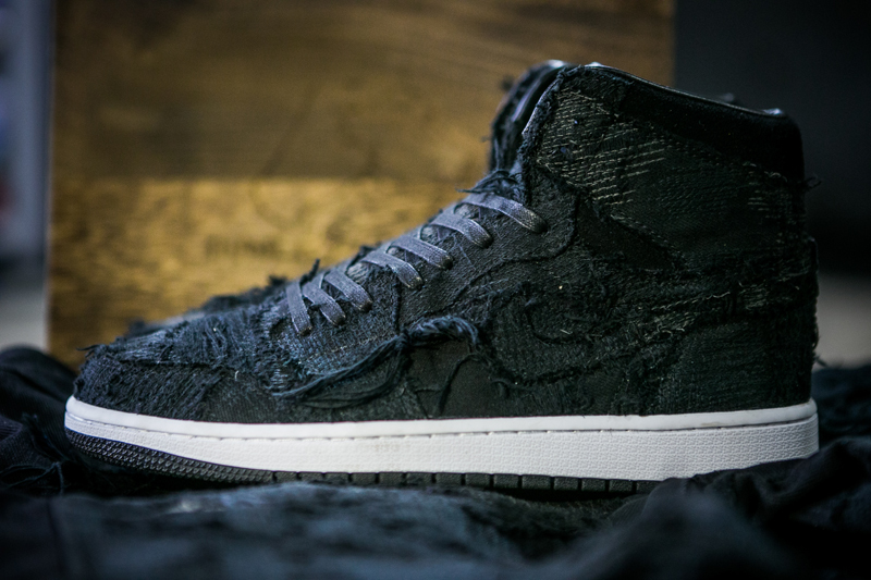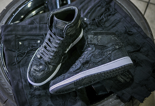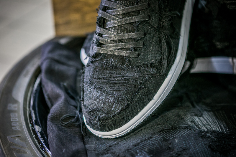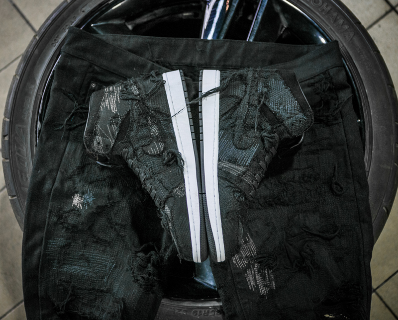 近期国内定制团队 Inner Alchemy也是以AJ1为蓝本进行客制设计,采用了牛仔裤的丹宁面料呈现并不新奇。但是这一面料却是来自于2005年知名潮流品牌UNDERCOVER推出的一款经典破洞牛仔裤。鞋面和牛仔裤原本的风格保持一致,视觉效果特别。