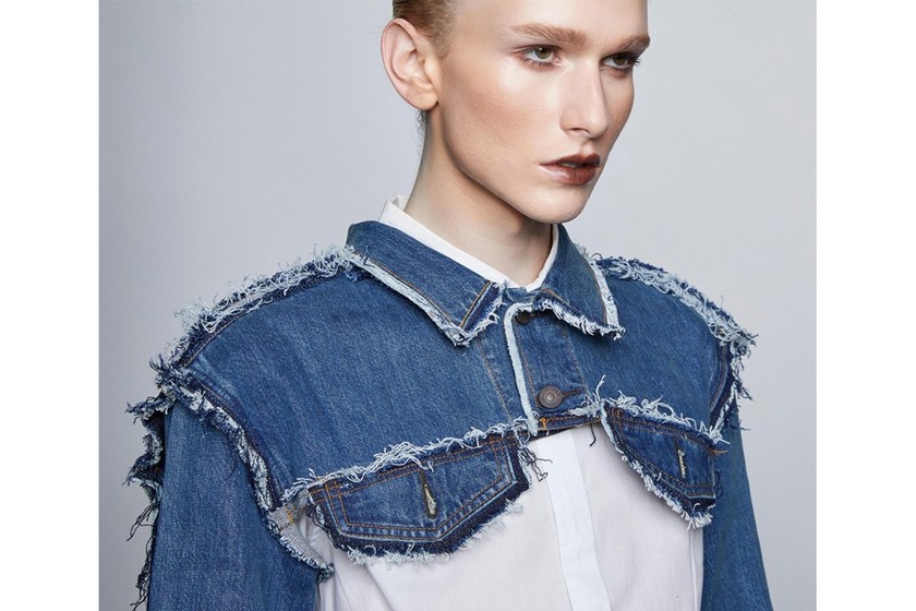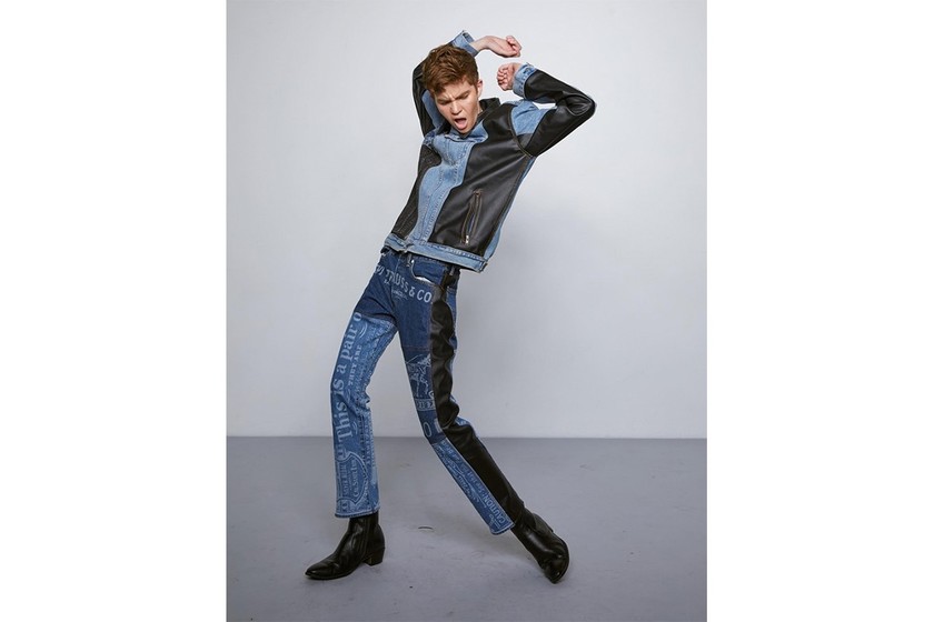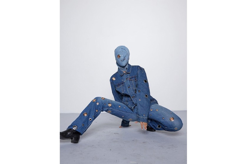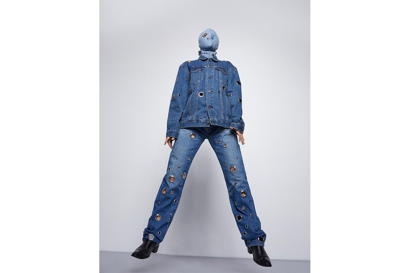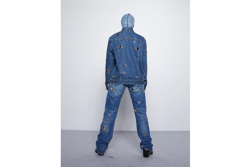 不同丹宁面料拼图重组,牛仔与皮革缝制呈现等等设计方式让人叹为观止。而本次最“亮眼”的大概是打满圆孔眼的牛仔套装,密集恐惧症根本不敢看。此外,裤袋拼接呈现的全新夹克视觉效果也颇为神奇。