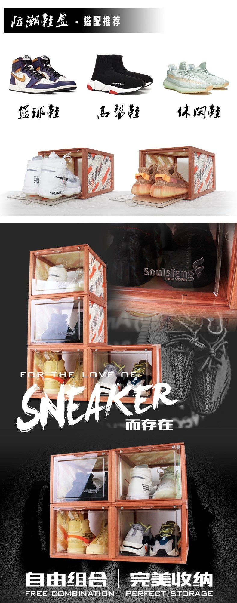 而一个精致的鞋迷也不应该只专注在鞋款本身或是出行时光鲜靓丽的外表穿搭,平时在家里的收藏摆放,让Sneaker真正融入到生活中才是正解。当朋友来到你的家中做客,看到一面由精美鞋盒搭建的帅气鞋墙,这是一件多么有牌面的事情啊。那么亚克力实木防潮鞋盒就是一个非常好的选择哦。