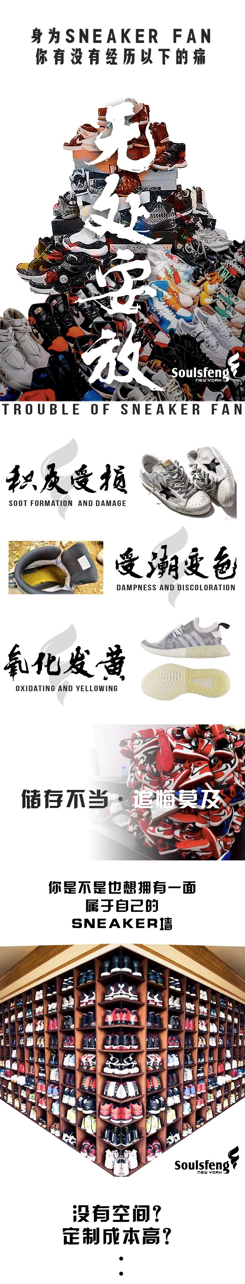 每一个热爱Sneaker的鞋迷经过长年累月的收集之后相信都会有满满一堆的鞋子,这时候往往问题就来了。原装鞋盒容易破损,鞋子也会因为长时间的堆放出现各种各样的问题,积灰受损、受潮变色、氧化发黄,不合理的收藏方式绝对会让你对爱鞋追悔莫及。另一方面,大量设计平平无奇、颜色普通的鞋盒堆积在家里既占地方又不美观,也让房子装修的精美程度大打折扣。