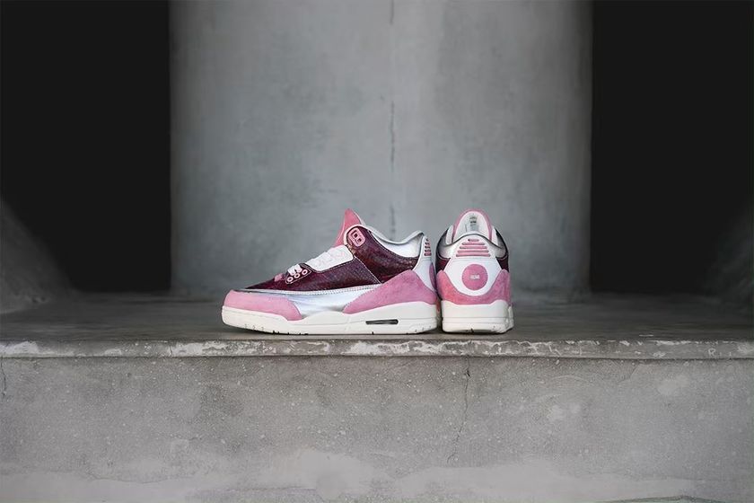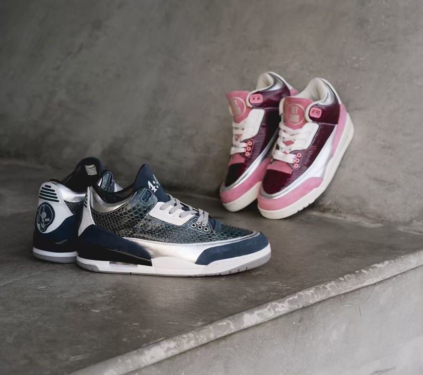 我们可以看到这两款 AJ 3 ,一款以墨蓝色为主打,另一款以粉色为主调演绎。蟒纹元素搭配银色细节以及高级麂皮,呈现出迷人的魅力。鞋舌和后跟处点缀的图案,彰显了鞋款的特殊身份,精致无比。