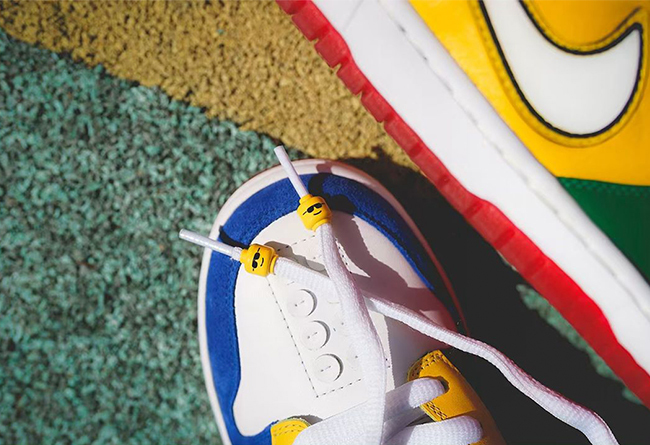 以熟悉的5种乐高配色红、黄、蓝、绿、白拼接打造,这双鞋还是独特的鸳鸯设计,皮革和麂皮的结合也让鞋款拥有不俗的质感。模仿积木接口打造的鞋头和鞋舌细节,让人眼前一亮。再配合鞋带头的乐高小人以及后跟特殊形式的 Nike logo ,吸睛度爆棚。