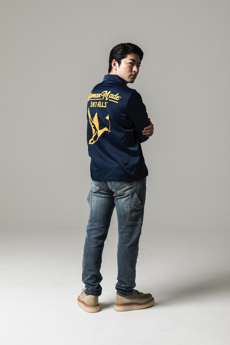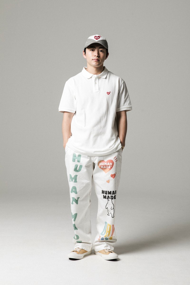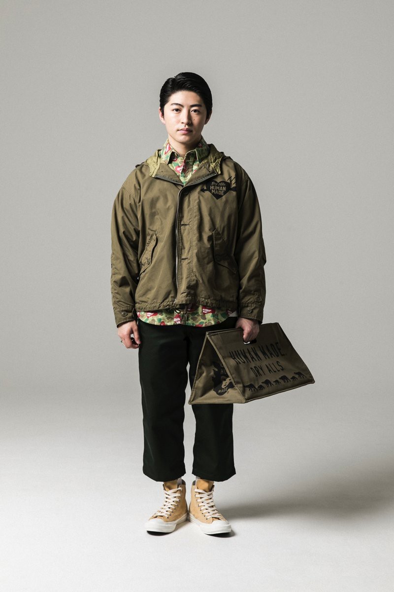该系列单品包括 oversize 牛仔外套,宽松长裤,图案印花衬衫,三角形手提包和围巾等等,在设计上带有浓郁的复古工装风格。撞色设计,醒目的HUMAN MADE logo 以及诙谐的印花图案的加入,让这一系列成熟又有俏皮感,看点十足。