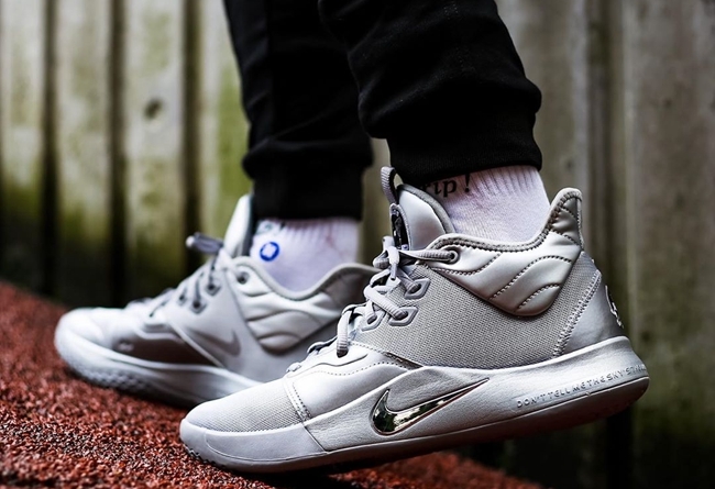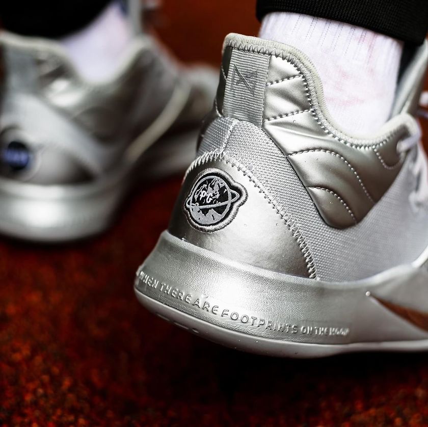 这款配色在设计上与 PG 3 首发配色相似,带有反光细节的全银色鞋面,搭配鞋舌处的 Apollo 11 标志,鞋跟的NASA 以及 PG 标志,辨识度极强。