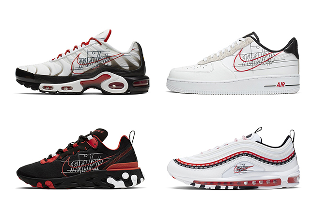 系列包括 Air Force 1、Air Max Plus、Air Max 97 和 React Element 55 四双鞋款,均以经典的红白黑色调为主打。造型复古的手绘 Nike logo 、几何线条以及渐变元素的注入让这一系列复古而独特。皮革、麂皮等多种材质的运用也让系列鞋款充满层次感。