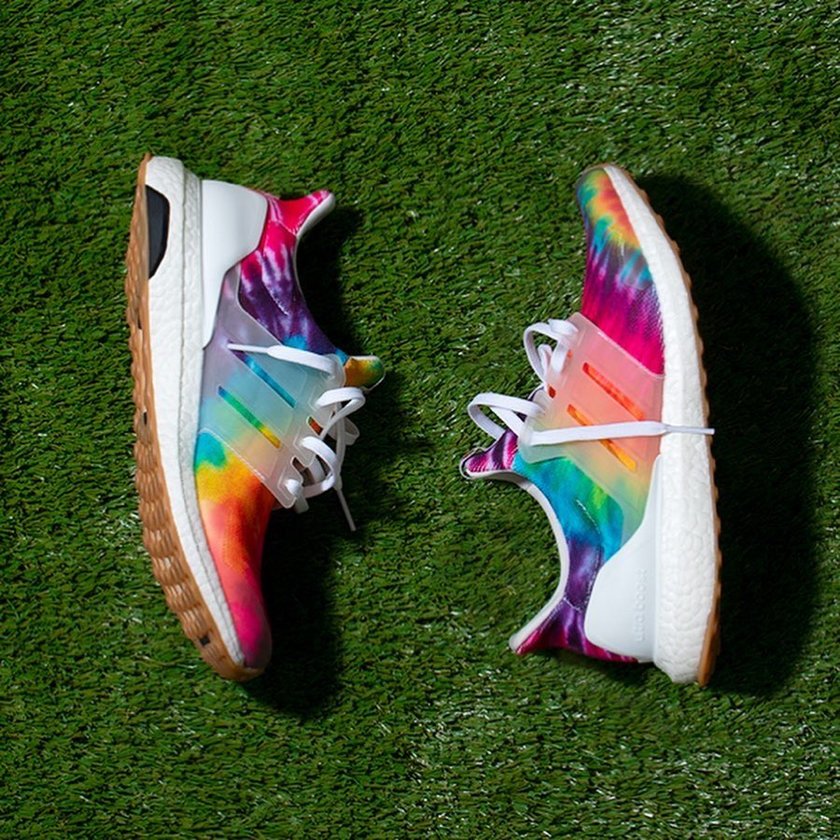 这款联名配色采用了双方联名惯用的彩虹扎染设计,不同层次的色调渲染碰撞,搭配透明鞋身支撑,带来了强烈的视觉冲击。鞋舌上不同的 logo 点明了联名身份。