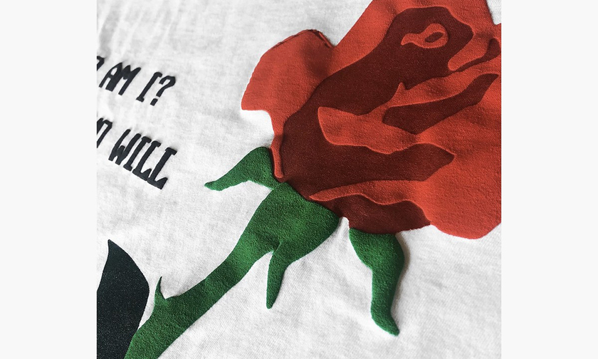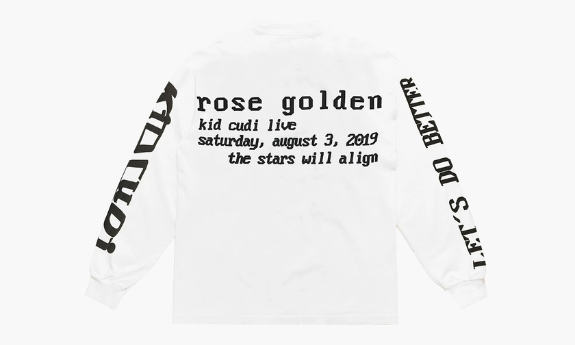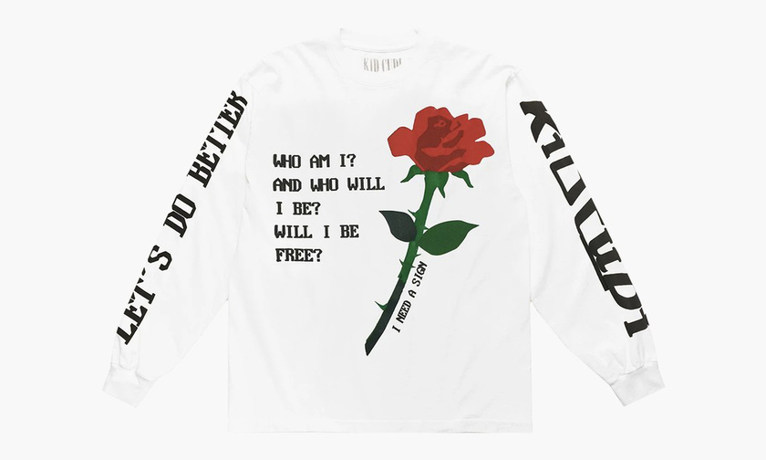 这款单品以白色为主打,一朵超大的玫瑰印在正面,搭配“Who am I? And who will I be? Will I be free? I need a sign.”字样,街头感十足。 袖子上写着的 “Kid Cudi” 和 “Let’s do better“,也丰富了设计,让整体不再单调。