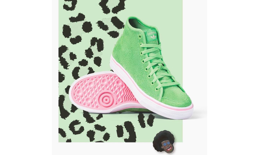 高帮款以绿色和粉色搭配示人,翻毛皮材质的运用,让整体清新又有质感,搭配 Na-Kel 头像的 Pin 趣味十足。低帮款设计就比较简单,经典黑红配色,低调百搭又酷炫。