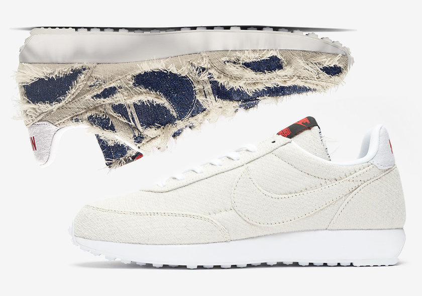 相信很多朋友也都了解了这次的新配色,主题 “Upside Down” 与《怪奇物语》剧中的翻转世界呼应。三双鞋表面都是以类似麻布的材质覆盖,暴力撕开或者用火烧掉浅层布料后,我们就能看到内里的丹宁材质。