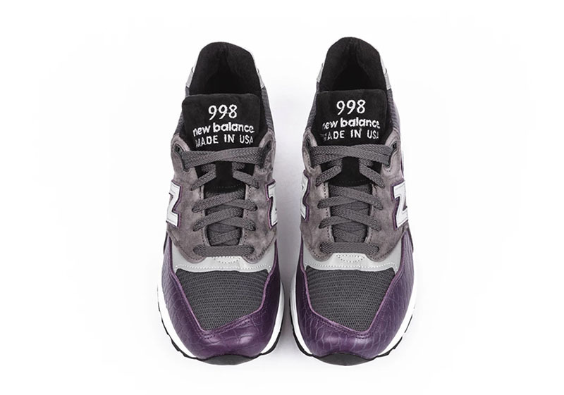 复古跑鞋爱好者颇为青睐的美产 New Balance 998 此番释出了极其抢眼的全新配色。新配色以紫色和灰色为主打,独特的鳄鱼皮鞋面纹理是这款配色最大的亮点。