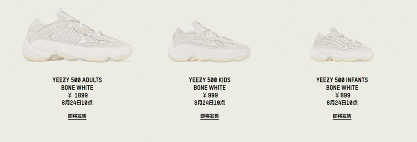 目前,官网已经释出了发售预告,Yeezy 500 “Bone White” 将于8月24日10点以全家族尺码正式发售,发售价为¥899-¥1899 元。喜欢的小伙伴可以留意一下,不要忘记了。