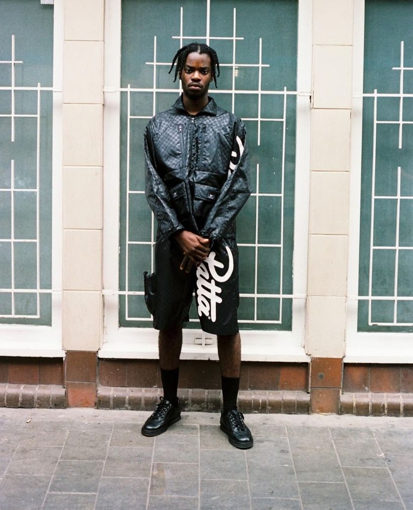 双方的这次联名系列以机能性作为设计点,打造了包括防水夹克外套及运动短裤在内的多款单品。其中防水夹克以黑色为主调,棋盘格暗纹贯穿整体,搭配显眼的白色胶印 “Patta” logo ,辨识度极高。此外,背面的交叉背带细节,设计感极强,让人一看就很心动。