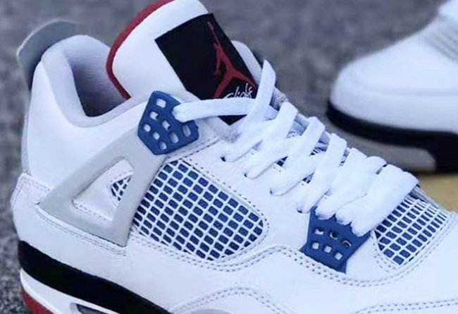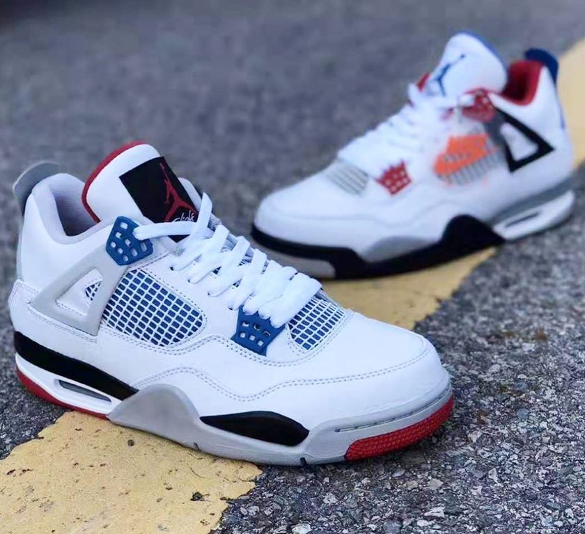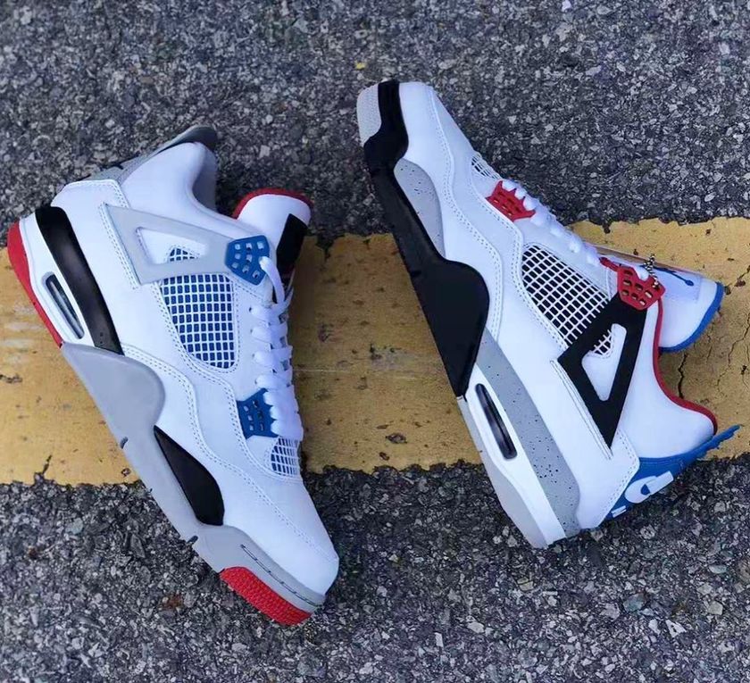 细节处则融合了 AJ 4 经典的黑红、白水泥、白蓝和白红配色,以四色鞋带扣,红蓝鞋舌和鸳鸯后跟凸显“What The” 风格。