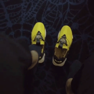 揭开就看到了全新的 Adapt Huaraches ,鞋身以黄色编织材质打造,搭配黑色细节和鞋侧支撑,造型前卫。按动中底按钮,可以看到鞋面快速收紧,如果上脚,包裹性和贴合感必然不俗。而棕色和白色相间的波浪纹大底,从视觉上就能感受到不同凡响的抓地力和耐用性。