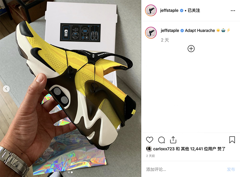 这两天话题性最高的应该就是 Nike 即将推出的全新自动系带鞋款 Adapt Huaraches ,虽然很多鞋迷在 Adapt BB 发售时就曾吐槽:我自己可以系鞋带,但当新产品推出后还是跃跃欲试,所以这款新作尽管目前褒贬不一,预计发售后还是会真香。此番,Staple 主理人 Jeff Staple 就抢先入手了黄色版本 Adapt Huaraches ,在网上释出了开箱和试玩视频。