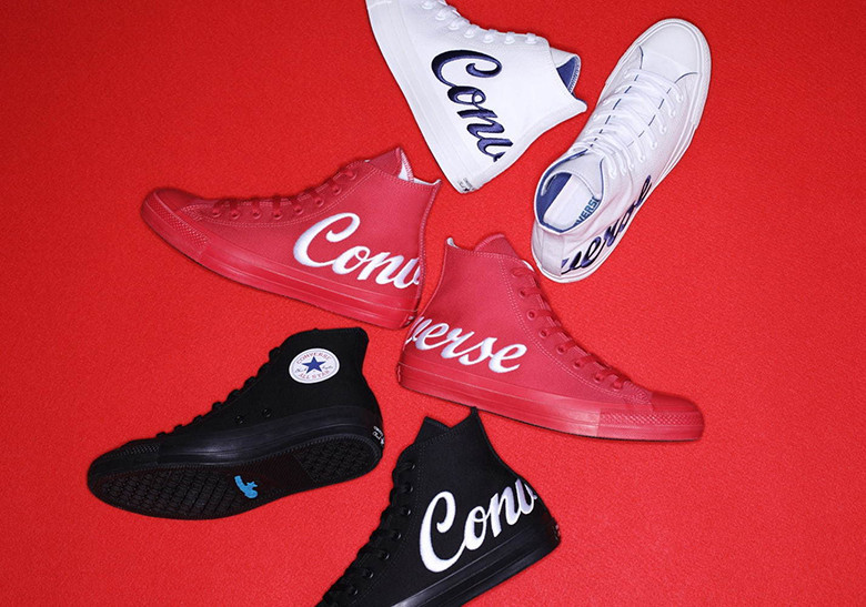 这一系列共有黑白红三款配色,花体刺绣 CONVERSE logo 作为主打设计呈现在鞋身上,搭载与整体呼应的同色系硫化中底,潮流感和创意十足。