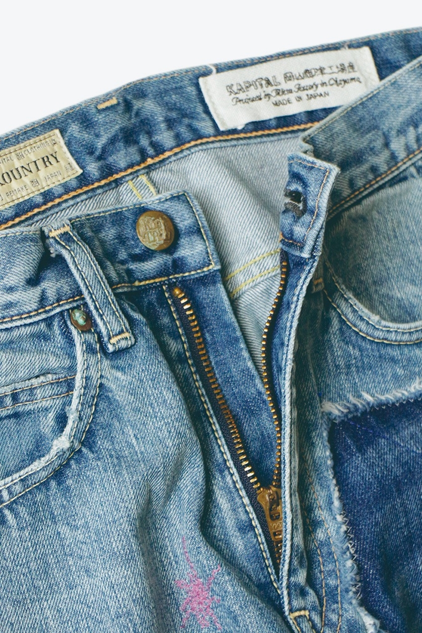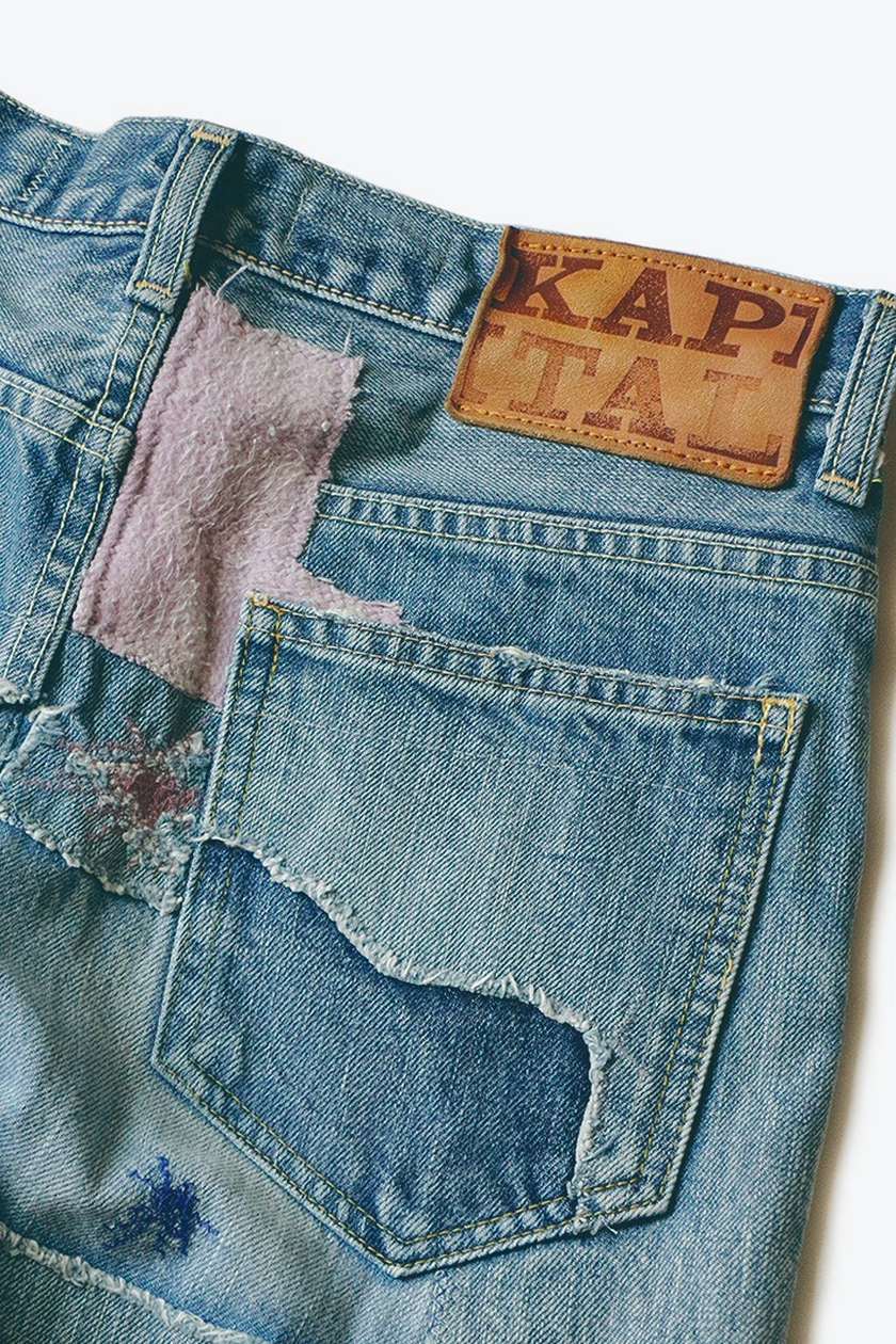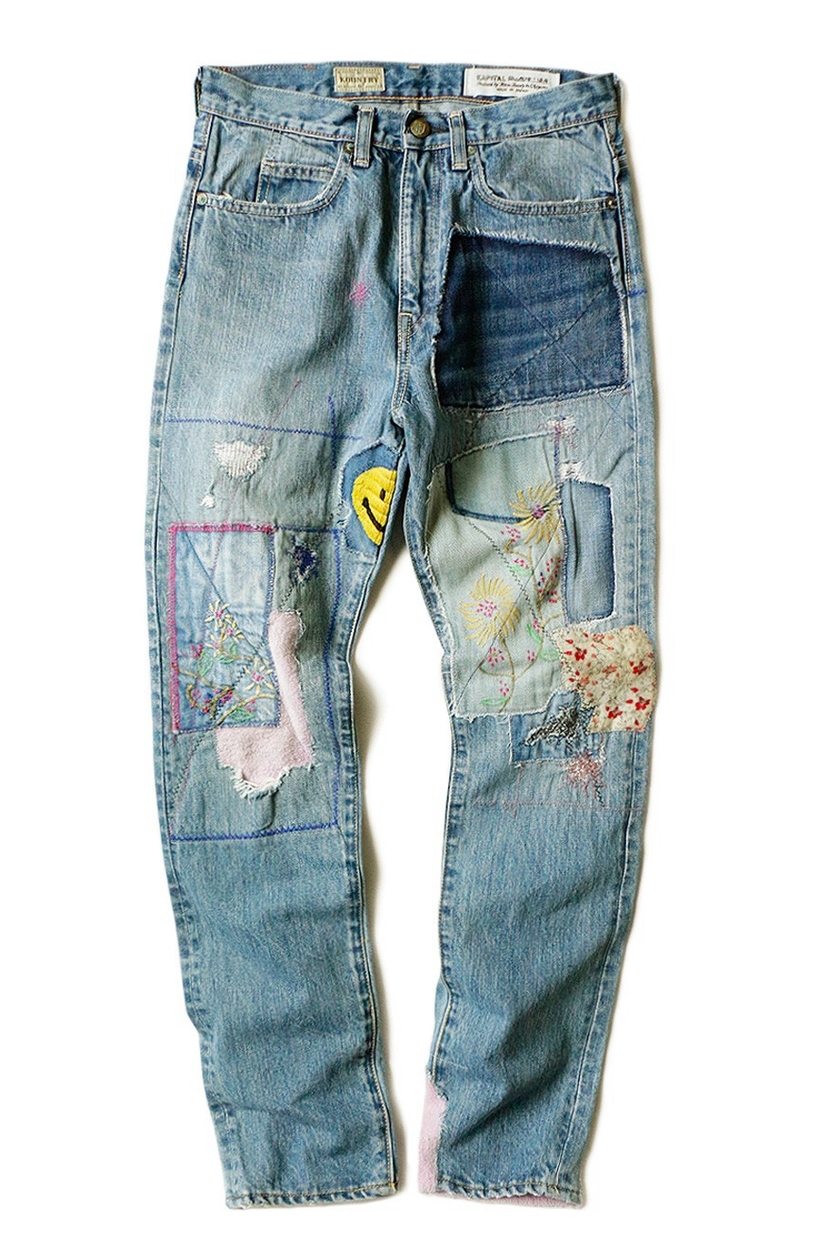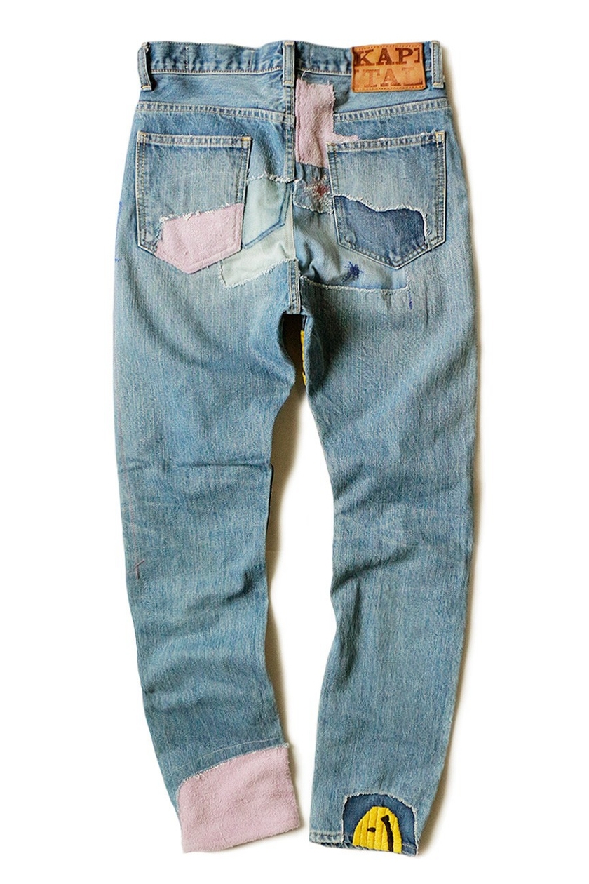 近日,KAPITAL 再度带回了一款人气单品 14oz Denim 5P OKABILLY 牛仔裤。这款牛仔裤以 KAPITAL 惯用的拼接手法打造,灯芯绒碎花布、淡紫色抓绒材质和深浅丹宁材质的结合让这款单品民族风浓厚,而独特的黄色笑脸图案的注入,也让这款牛仔裤辨识度极强。