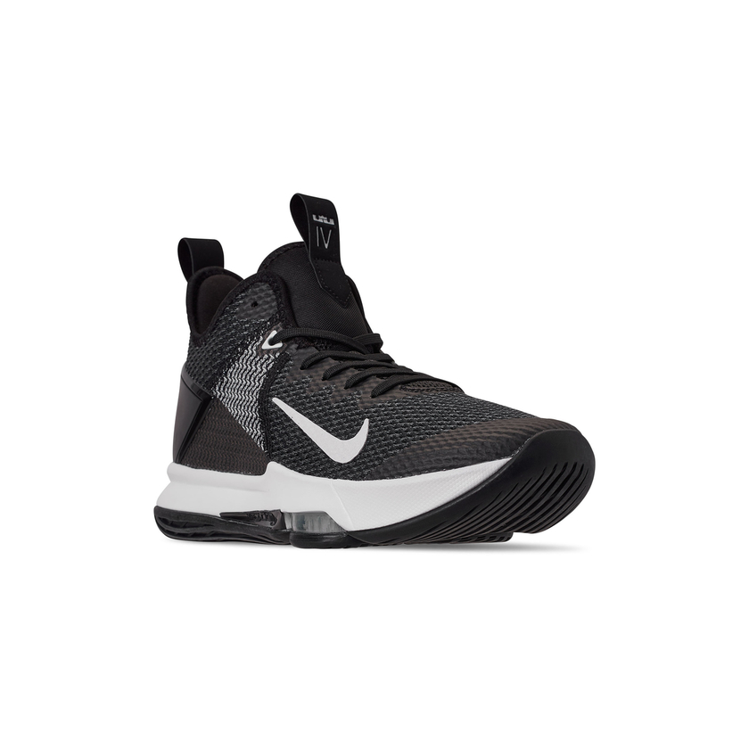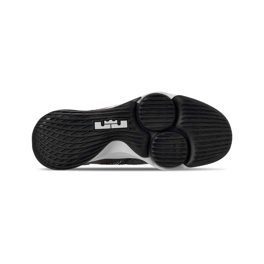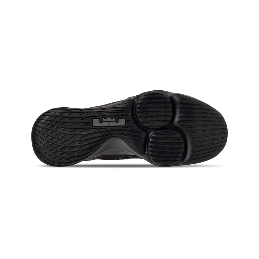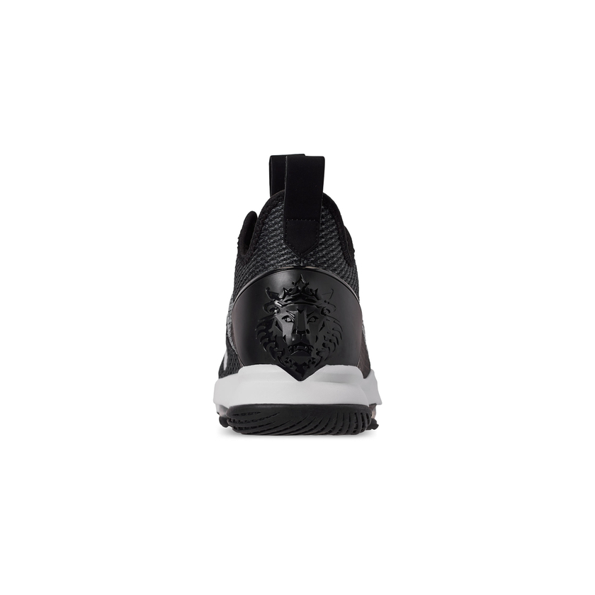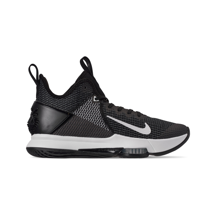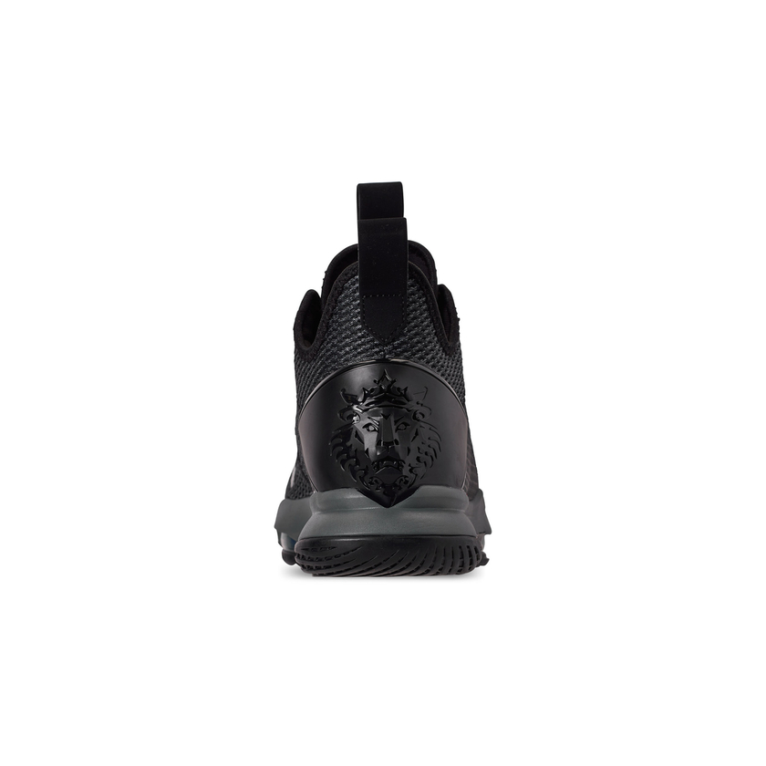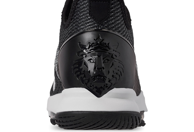 这款 Nike LeBron Witness 4 鞋身以黑色织物打造而成,颇有新意的不同色调拼接纹理,让人眼前一亮。后跟霸气的狮头浮雕符合詹皇风格,气势爆棚。