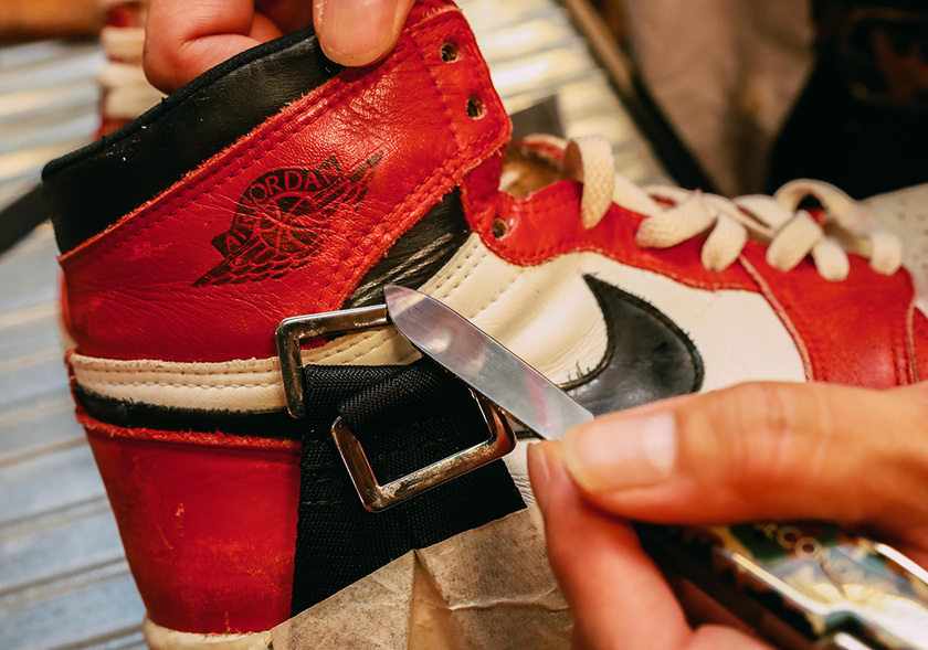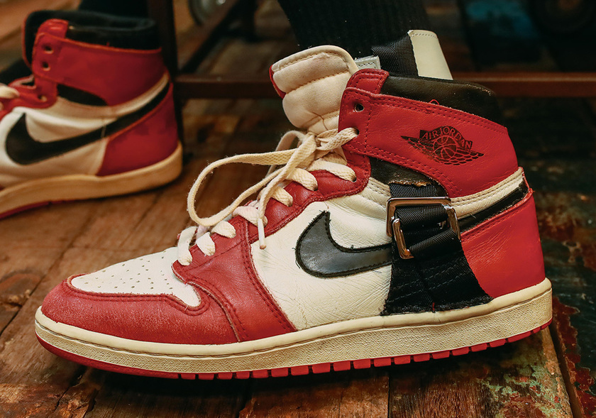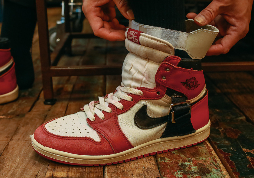 1985 年,Nike 曾为伤病的乔丹打造过一款复健版 Air Jordan 1 ,以此为灵感,著名的新加坡球鞋定制玩家 SBTG 客制了眼前的这款 AJ 1 。