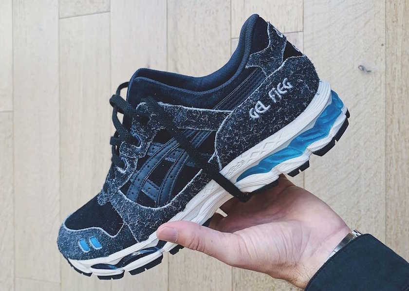 黑色翻毛皮、麂皮与皮革拼接而成的鞋面,层次感丰富。搭配抢眼的蓝色细节,辨识度极强。而这款联名最独特的点还是后跟传统的 Gel Lyte 刺绣被“Gel Fieg”取代。