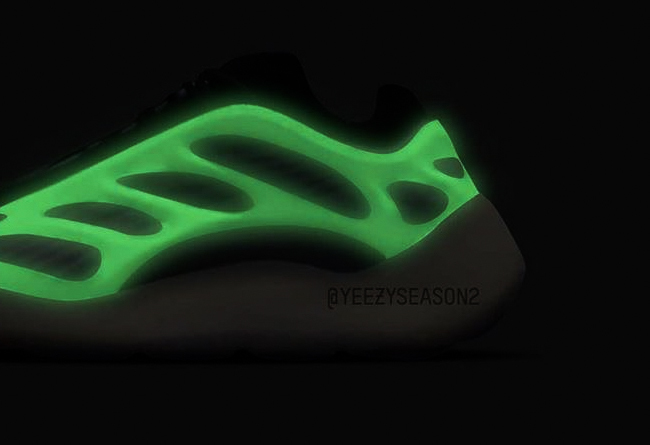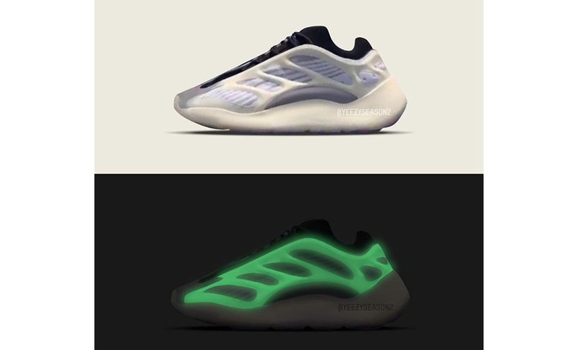 这款 Yeezy 700 V3 鞋身以镂空框架搭配灰色编织鞋面呈现,乳白色厚实中底以及其他黑色细节的点缀,带来满满的前卫高街感。而这次设计最大的亮点在于镂空支架竟是夜光效果的,在黑暗中能展现出炫目的效果。