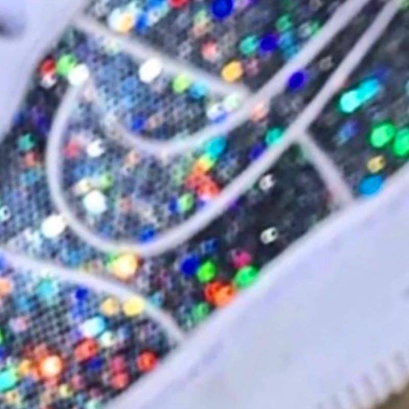 虽然曝光的仅有一小部分模糊的鞋侧细节,但仍可以看出新配色鞋面以银色亮片覆盖,经过不同角度的光线折射出多彩效果,炫目至极。而粗体白线勾勒的 Swoosh 和鞋身细节,又为整体增添了清新感。