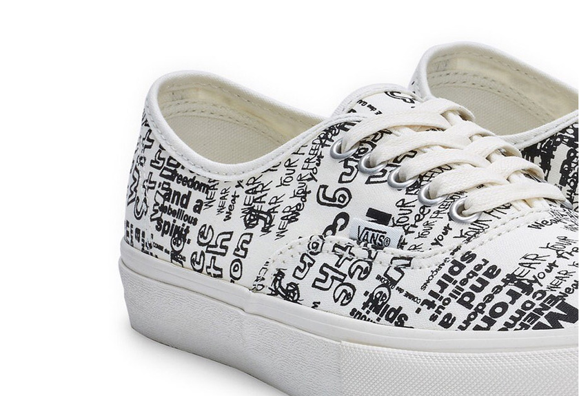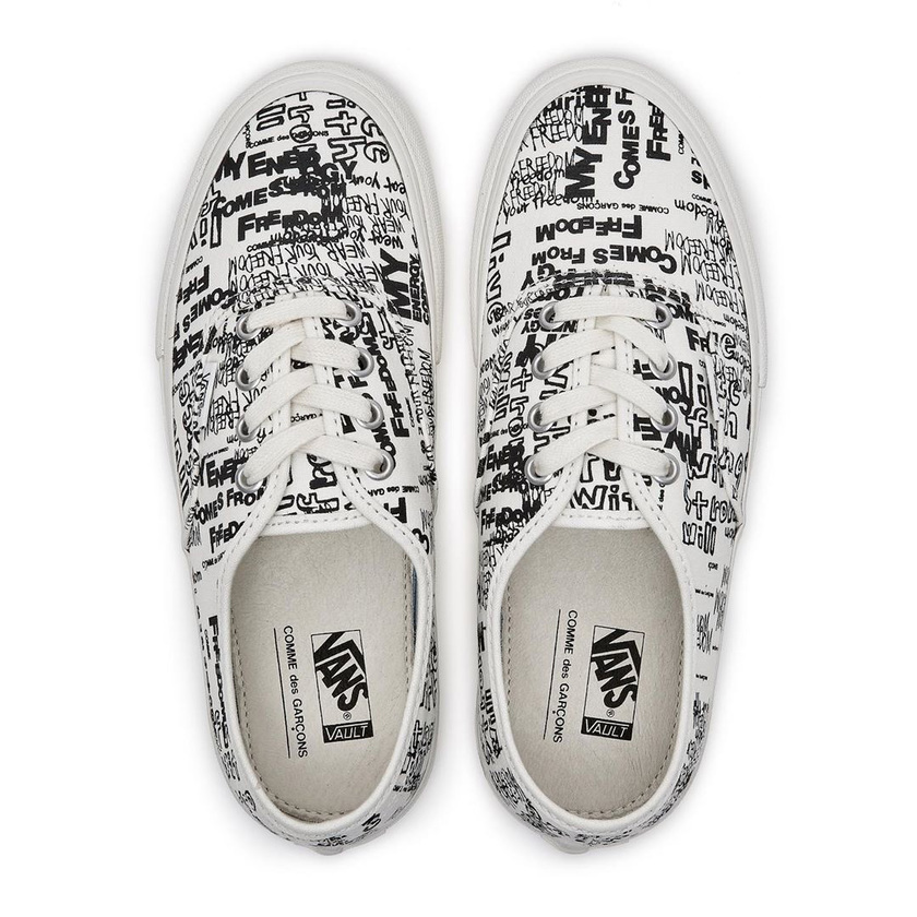 CDG近期与Vans再次展开联名合作,在经典的Authentic鞋型带来一款全新的白底黑字设计。鞋身以白色打底,将各种字母单词以黑色的涂鸦风格字体呈现,带来满满的潮流感和街头时尚范。既有鲜明个性同时又相当百搭,是近期不错的穿搭选择。