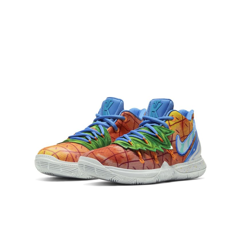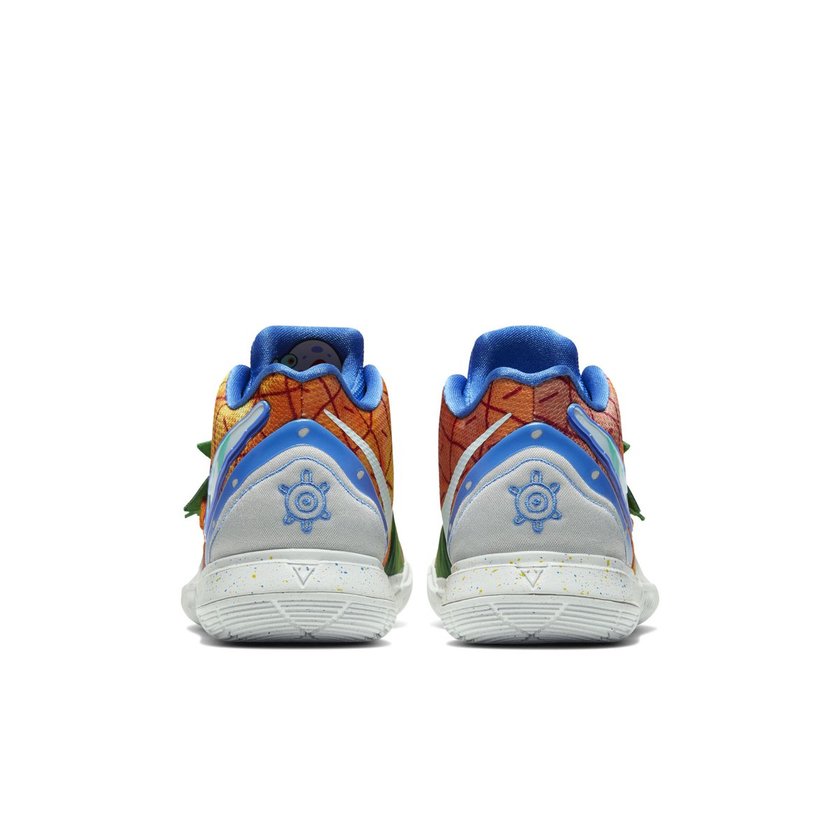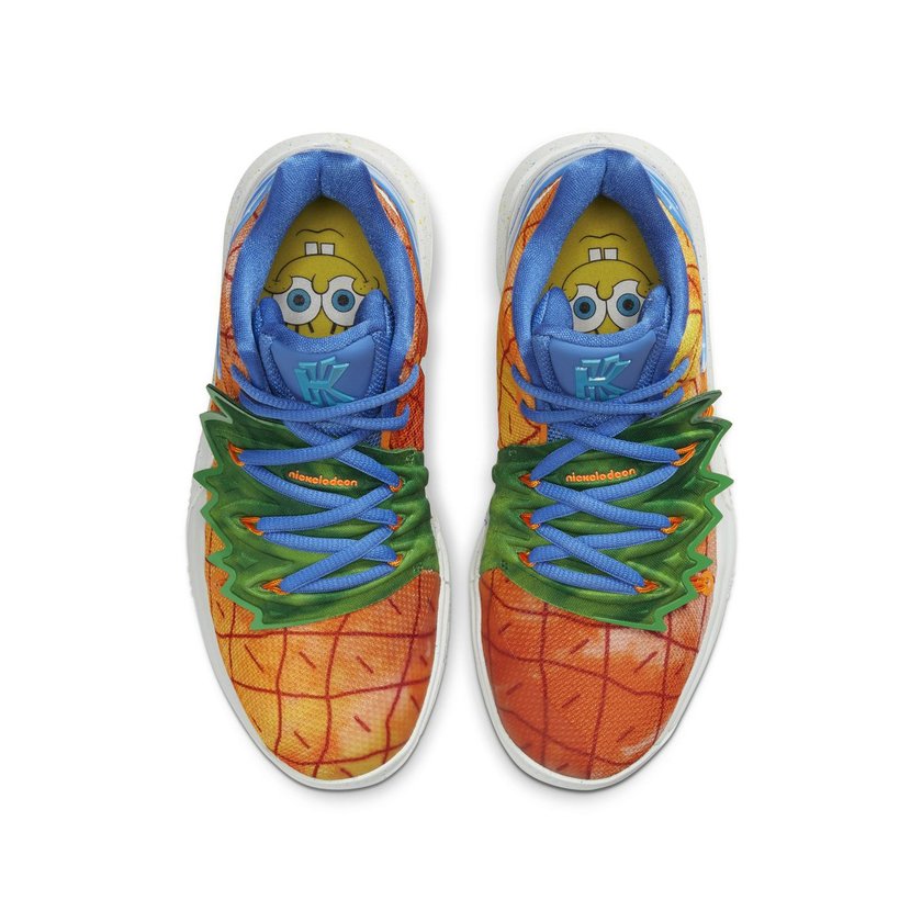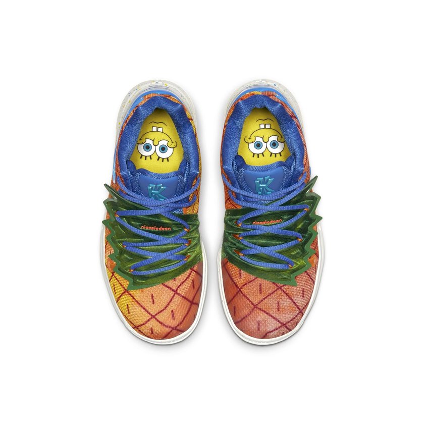 这款新配色灵感来自海绵宝宝住的菠萝屋,鞋面主体图案使用了和菠萝屋一样的颜色和纹理,Kyrie 5特别的鞋带系统则使用绿色呈现,和菠萝屋上的植物完全一致。