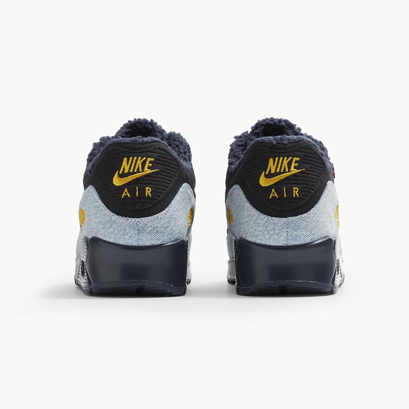 其中 Air Max 90 联名风格与此前的 Air Force 1 风格相似,以黑色、深蓝色和浅蓝色丹宁材质拼接而成,搭配亮黄色细节、鞋舌处皮质鞋标以及 Levi's 标志性红标,经典复古又极具辨识度。