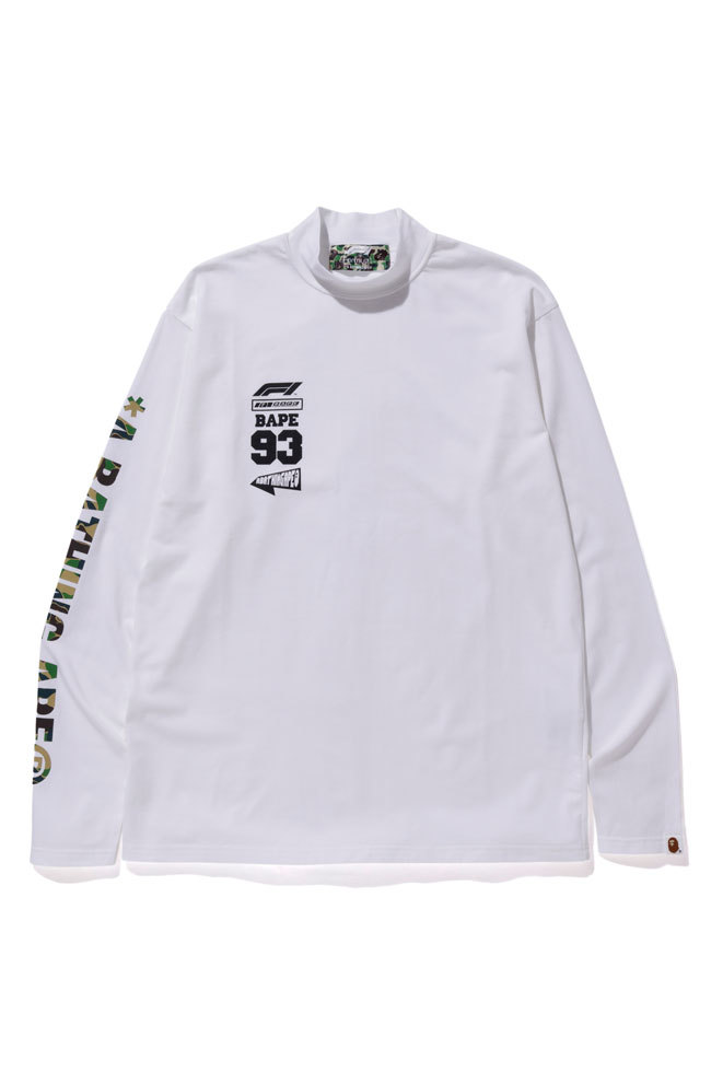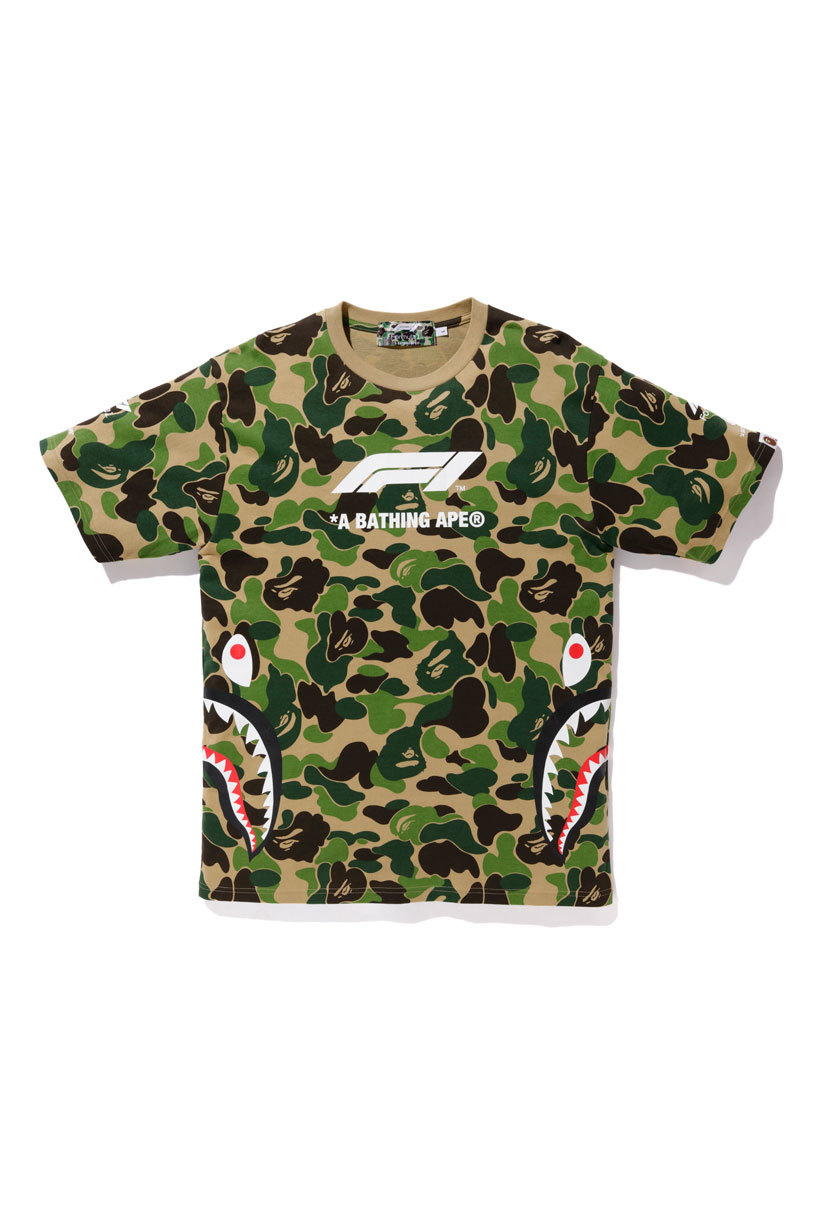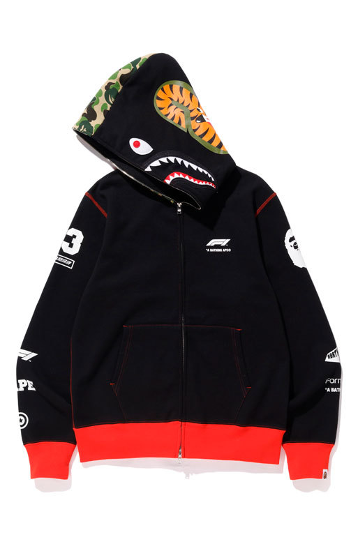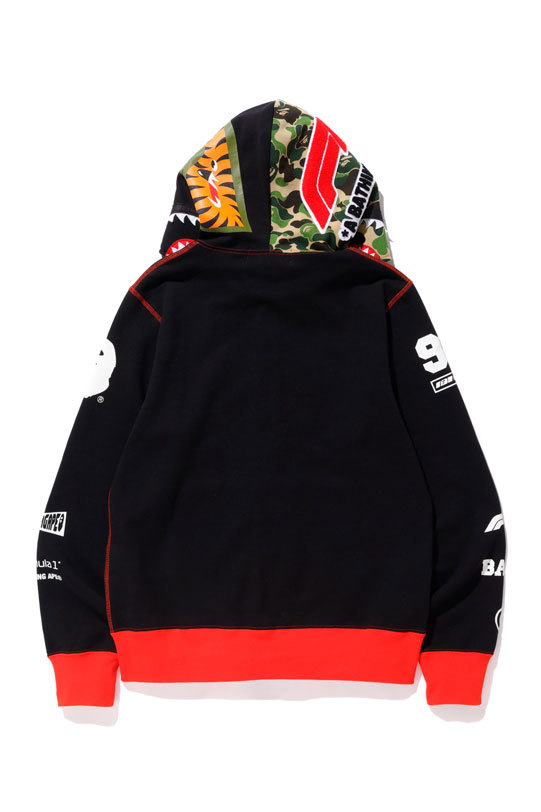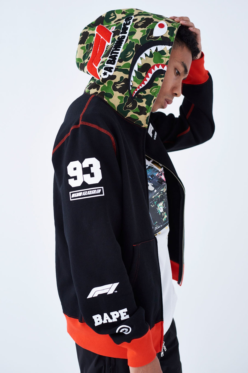 系列单品在设计上加入了 BAPE 标志性的迷彩元素、猿人头、鲨鱼印花以及代表 BAPE 创立年份的数字 93 ,搭配 Formula 1 标志性红色,呈现出前所未有的赛车运动感与街头潮流气息。