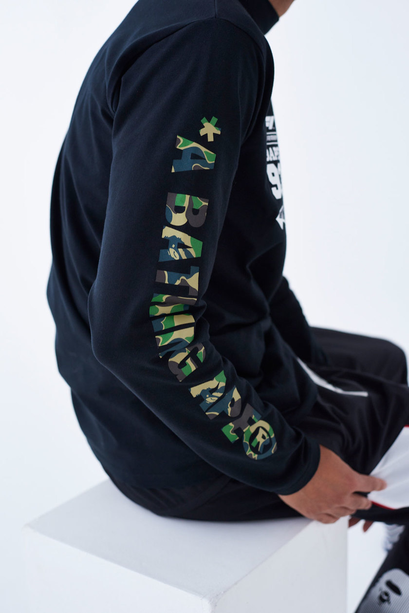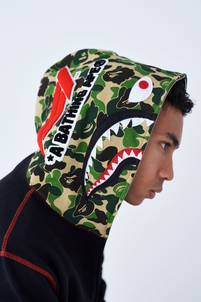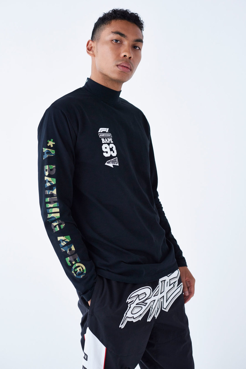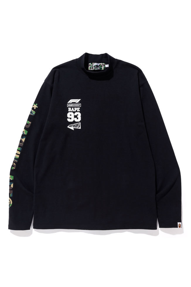 系列单品在设计上加入了 BAPE 标志性的迷彩元素、猿人头、鲨鱼印花以及代表 BAPE 创立年份的数字 93 ,搭配 Formula 1 标志性红色,呈现出前所未有的赛车运动感与街头潮流气息。
