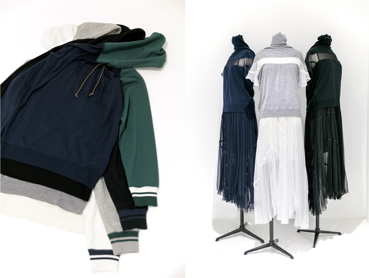 女装套头衫,以基本款高领针织衫为基础,在中部注入透明雪纺材质,增加了优雅柔美气质。搭配经过褶皱处理的雪纺短裙,上身必然惊艳。男装的圆领套头衫和连帽卫衣则注入了轻便的吸汗材质,加上不对称设计,潮流感十足。