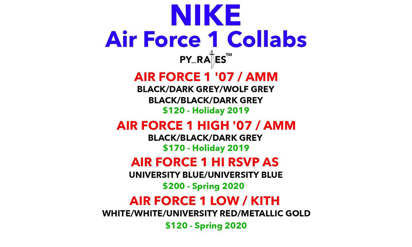 一直位于人气鞋款顶端的 Air Force 1 即将再度迎来重磅联名系列。这次是与三大美国本土潮流品牌 KITH、RSVP Gallery 和 A Ma Maniere 合作,其中与 KITH 和 RSVP Gallery 设计各一双,将于明年年初亮相。与 A Ma Maniere 打造 3 双,将在今年年底发售。