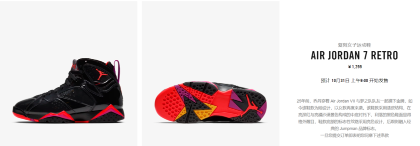 目前官网已经正式释出了这款 Air Jordan 7 的发售预告,将于 10 月 31 日正式发售,发售价为 ¥ 1299 元,喜欢的朋友不要错过了。