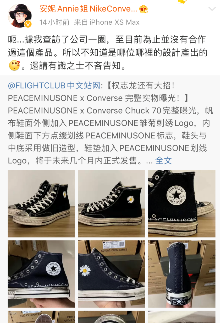 最近除了 PEACEMINUSONE x Air Force 1 联名以外,疑似权志龙与 Converse 联名的作品也受到了很多关注,不少潮流爱好者都被这款独具一格的脏脏鞋吸引了。而意想不到的是,今早 Converse 娱乐市场总监 Annie 亲自辟谣称:目前为止并没有合作过这个产品。也就是说这款连货号都出了的 chuck 70 很可能是双假鞋!