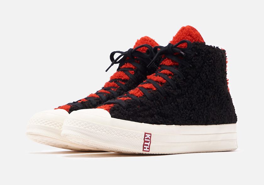而第二款材质也比较特殊,采用毛绒材质打造鞋身。黑红配色撞色拼接,致敬米奇经典形象。后跟 Converse 、Disney logo,与中底侧面 KITH logo 一同增强辨识度。