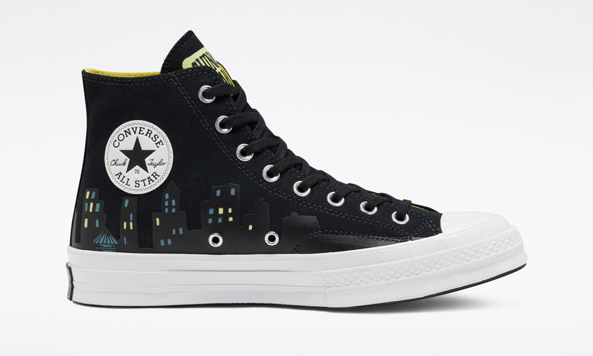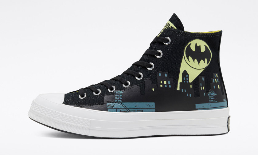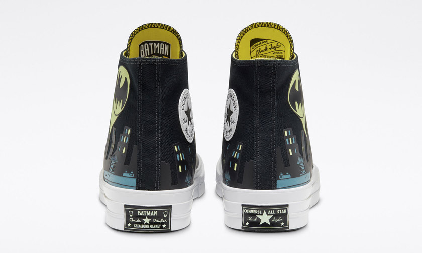 另外一款 Chuck 70 则由黑色主打呈现,鞋面哥谭市夜景以及投射于哥谭市上空的蝙蝠侠标志,独具巧思。