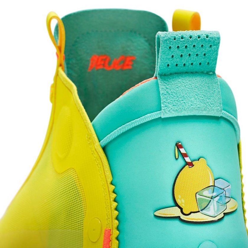 一款以塔图姆喜爱的柠檬汽水为灵感,采用大面积亮黄色和部分蓝色装扮呈现。后跟卡通冰块柠檬印花,可可爱爱,童心满满。