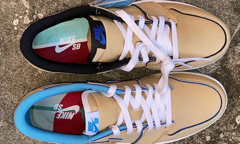这款联名 AJ 1 Low 最初由 Eric Koston 上脚曝光。其鞋面采用米黄色示人,左右脚内衬分别以蓝色和黑色点缀。而这款鞋最大的亮点在于鞋面似乎暗藏玄机,采用了可撕设计呈现,从每只鞋的各层边界上露出的色调也能看出这一点。